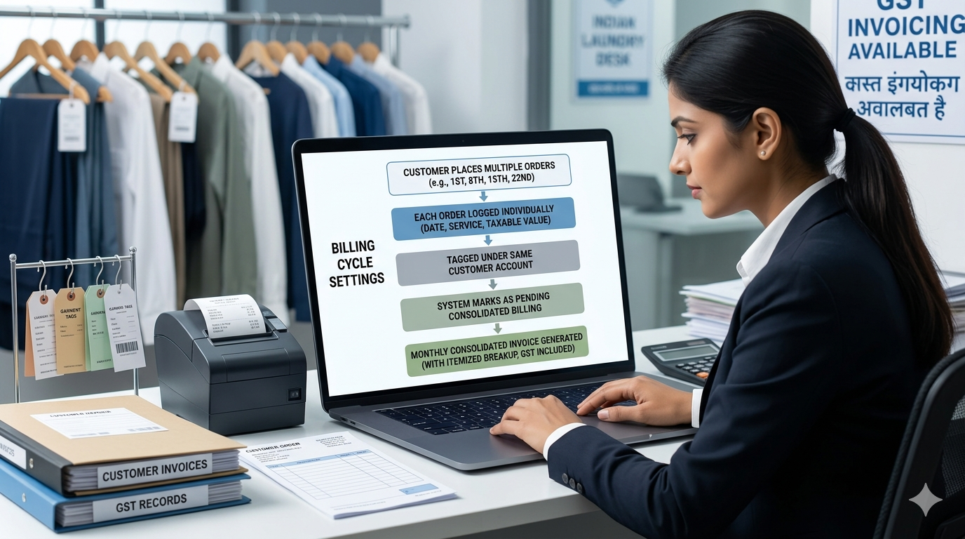 Modern laundry software handles this automatically. It tracks every order under a customer's account, tags them as pending billing, and generates a consolidated invoice on demand. The invoice includes a detailed breakup of each transaction, which satisfies GST requirements and keeps customers informed.