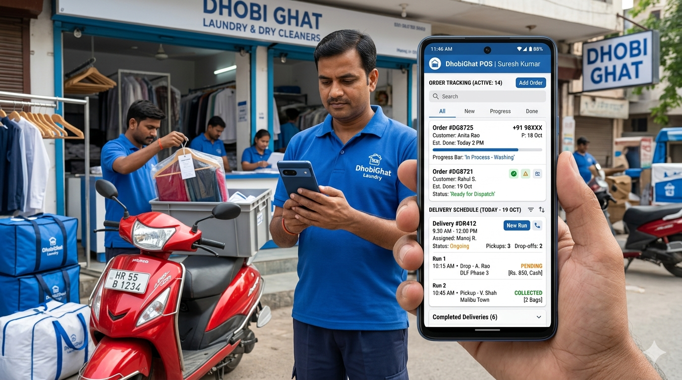 The system handles complex billing scenarios with ease—per-piece and per-kg pricing, express charges, corporate rates, complete GST compliance with proper documentation. Order tracking keeps customers informed automatically through SMS and WhatsApp notifications, reducing inquiry calls.